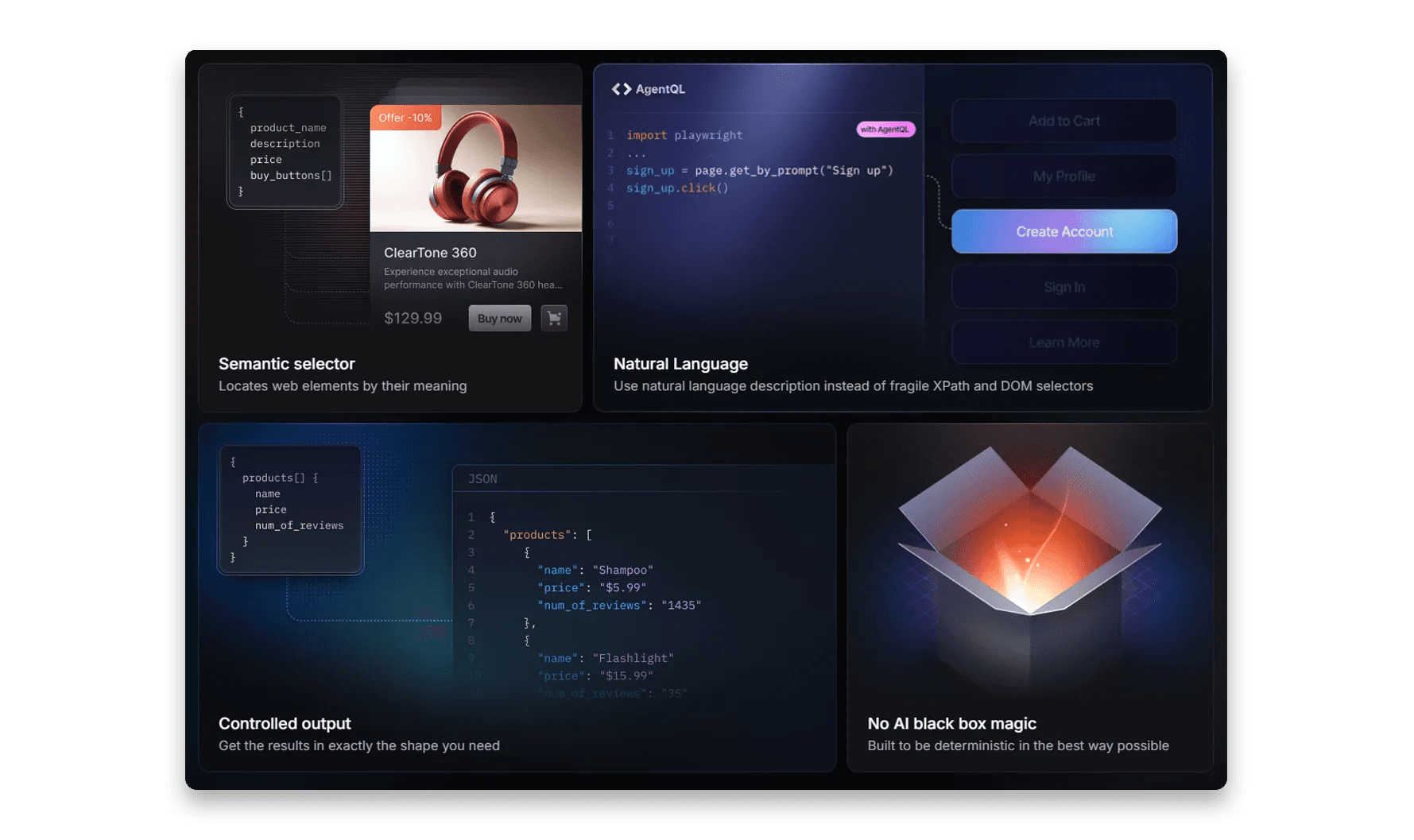 Need to find all the price data on an e-commerce page? Just tell AgentQL to find “price,” and it will retrieve all relevant data without the need for rigid selectors. AgentQL’s robust DOM processing and advanced prompt engineering ensure that your scripts are dynamic and context-aware.