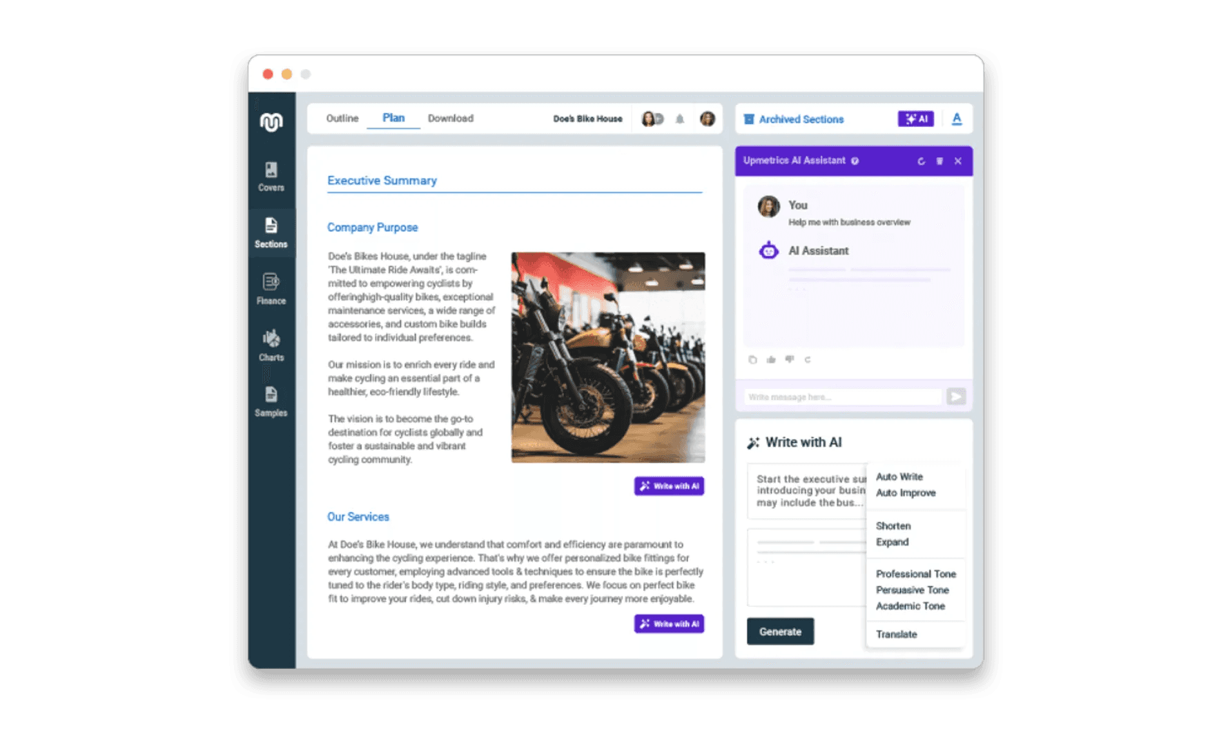 Are you overwhelmed by the thought of drafting detailed business plans, making accurate forecasts, and creating pitch decks? Upmetrics is here to take that stress off your shoulders. This AI-powered business planning software helps you streamline the entire process, so you can focus on turning your ideas into reality.