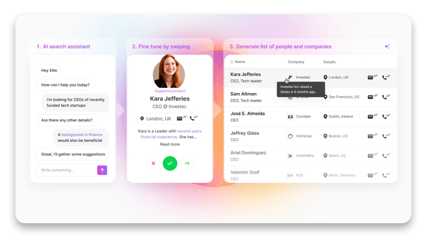 It works in three simple steps: First, you tell it who you’re looking for in your own words — no complicated keyword searches needed. Next, fine-tune the AI by swiping a few times, which helps the model get more accurate. You can also chat with the AI live to provide continuous feedback. Finally, with just a press of a button, Telescope generates a large list of highly targeted leads complete with contact info.