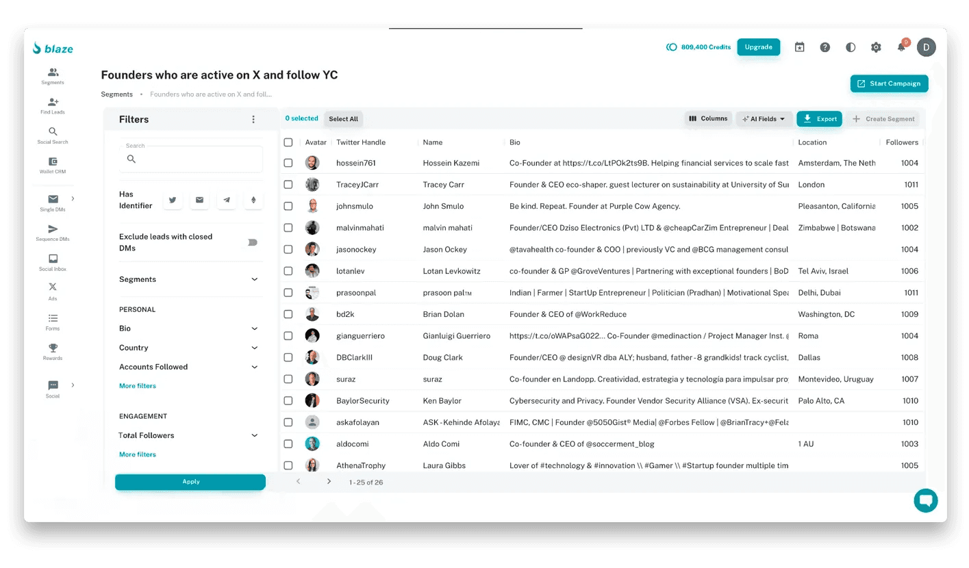 Imagine creating lists based on unique signals such as users liking your competitors’ posts or following relevant groups. Blaze uses those signals to identify qualified B2B leads on LinkedIn and X (formerly Twitter) who are more likely to convert and lets you send personalized DM sequences. You can auto-respond with AI, target leads with messages that resonate based on their social activity, and even add steps like following someone first to improve response rates.