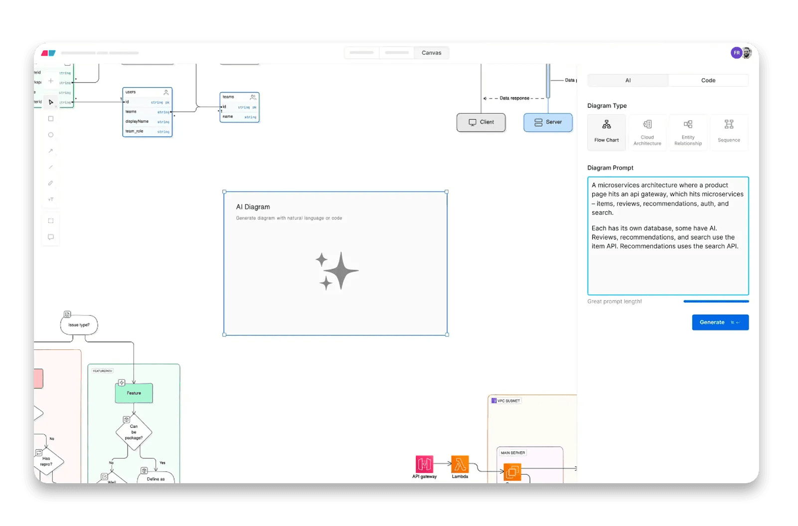Simply type out your ideas in natural language, and the app generates a beautiful, colorful, icon-studded diagram in seconds. You can easily tweak it to perfection and quickly generate an outline for your design doc. Choose from four different diagram types and even include images in your prompts if you’d like, with full control over editing.