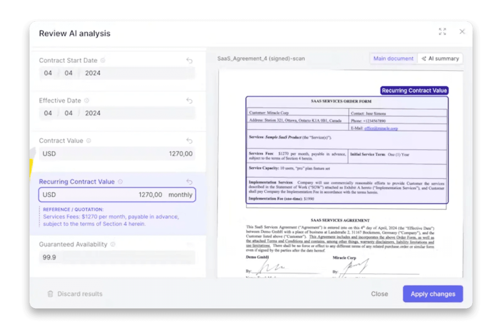 Whether you’re bulk importing existing contracts or creating new ones from templates, Fynk’s smart AI analyzes and summarizes your contracts, extracting key information like renewal dates and parties involved.