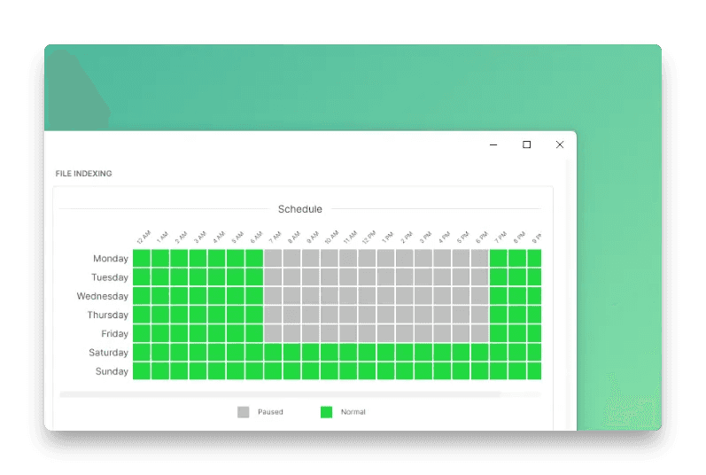 This way you can tell the app when to do indexing and when to stop. For that, go to the Preferences menu, scroll down for File Indexing and select the time slots of your choice.