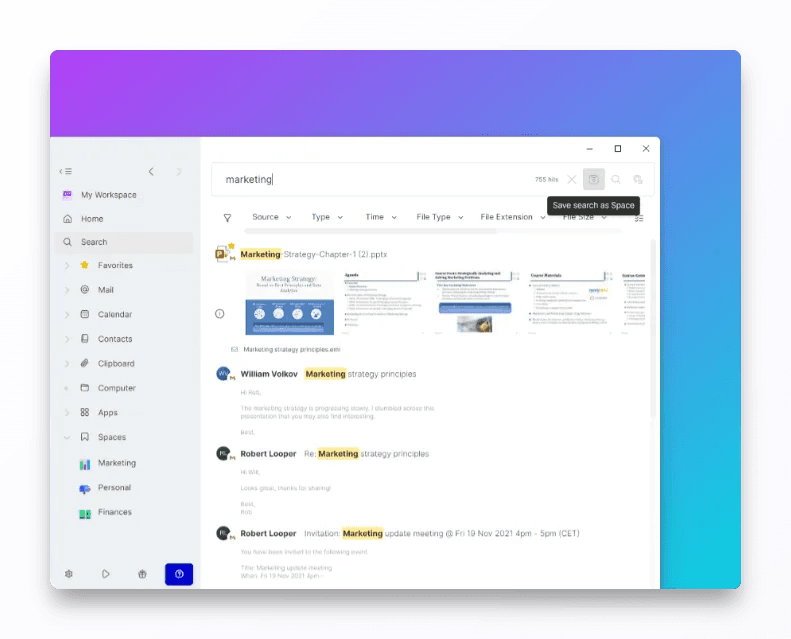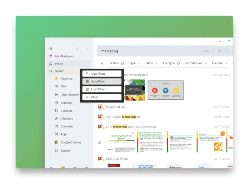 If you often use combinations of filters (e.g. “slides in dropbox in the last week”), then this one’s really helpful. You can just save a combination of filters and reload them in future searches, saving you time.
