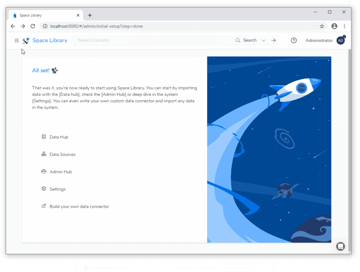 For the data ingestion, we’ve prepared a dump of the NASA library ready for you to use. It includes both the files and the metadata available on their site (with information on Authors, Organizations and Categories). The code for the data connector is available on our GitHub page, and all you need to do is to clone the repository and run the project inside it. Ahh, you’ll also need to have the latest NET SDK installed on your computer 😀.