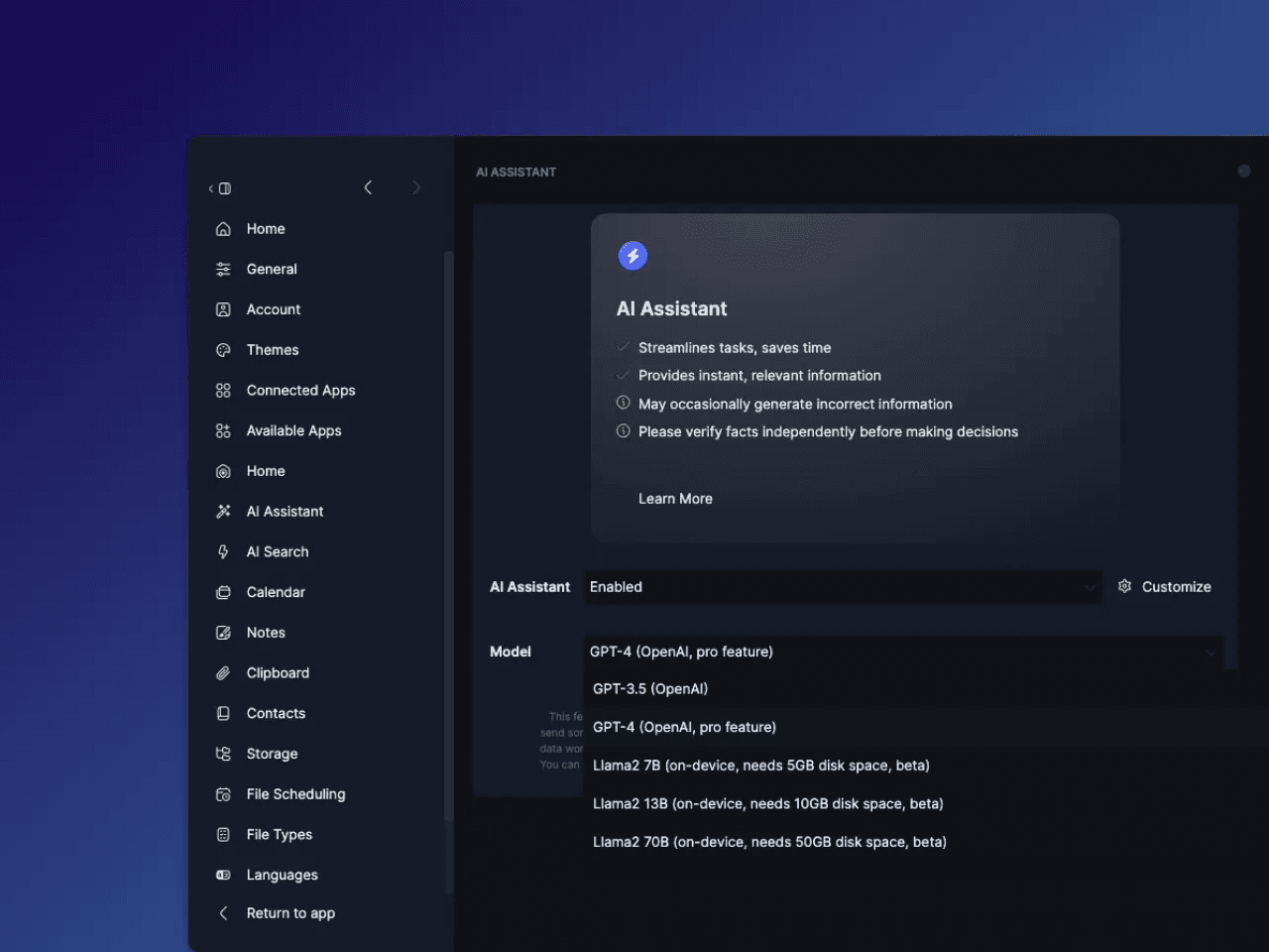 Today we’re delighted to announce that you can now select which model to use for the AI Assistant, including models running locally on your computer. That means you can get the AI Assistant’s features while processing all your data on your local device, by selecting one of our Llama2 integrations in Preferences.